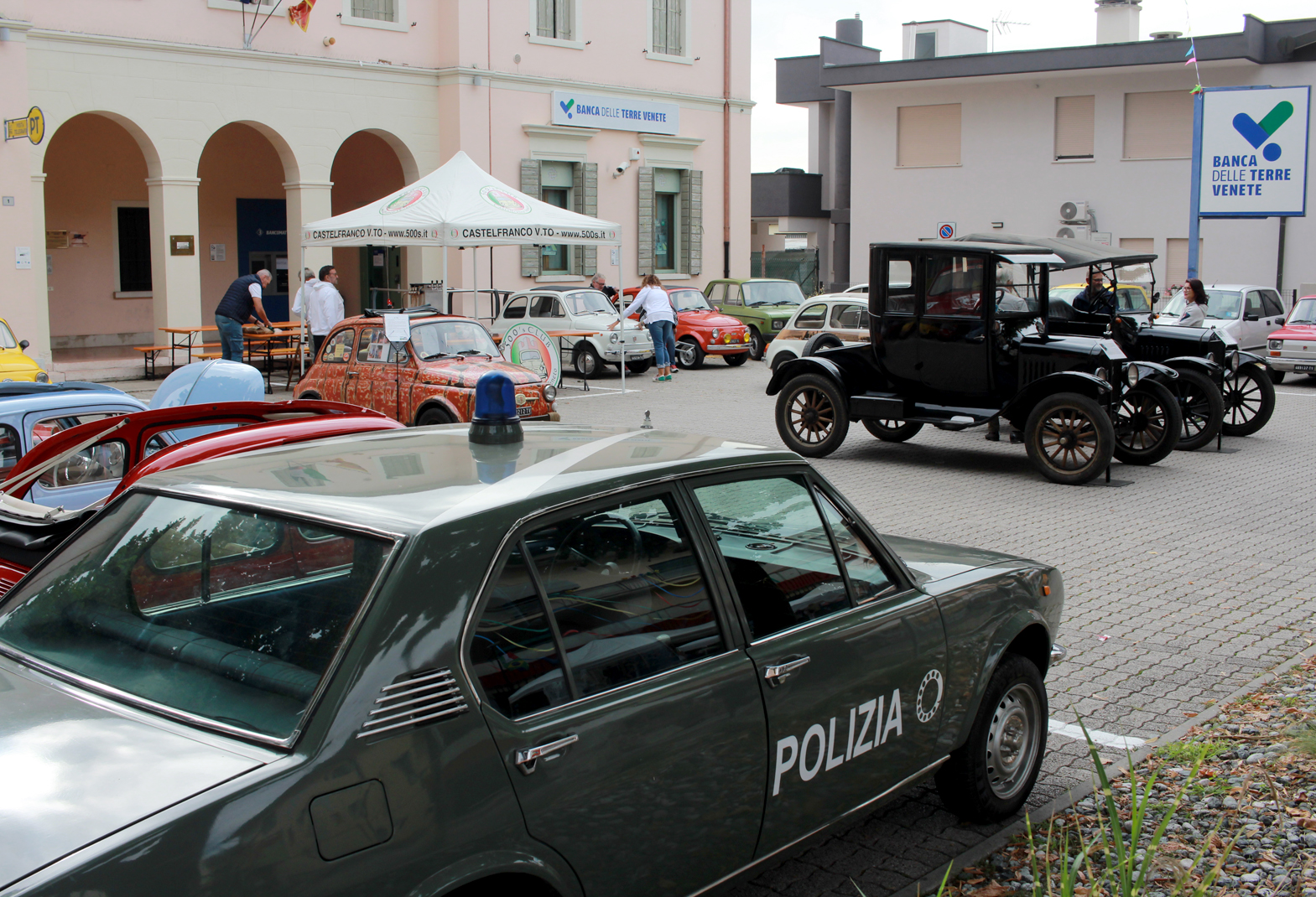 Numerose FIAT 500 d'epoca e nuove, fanno da cornice al mercatino. I vari modelli sono a disposizione del pubblico per fare uan foto oppure per un breve tragitto.